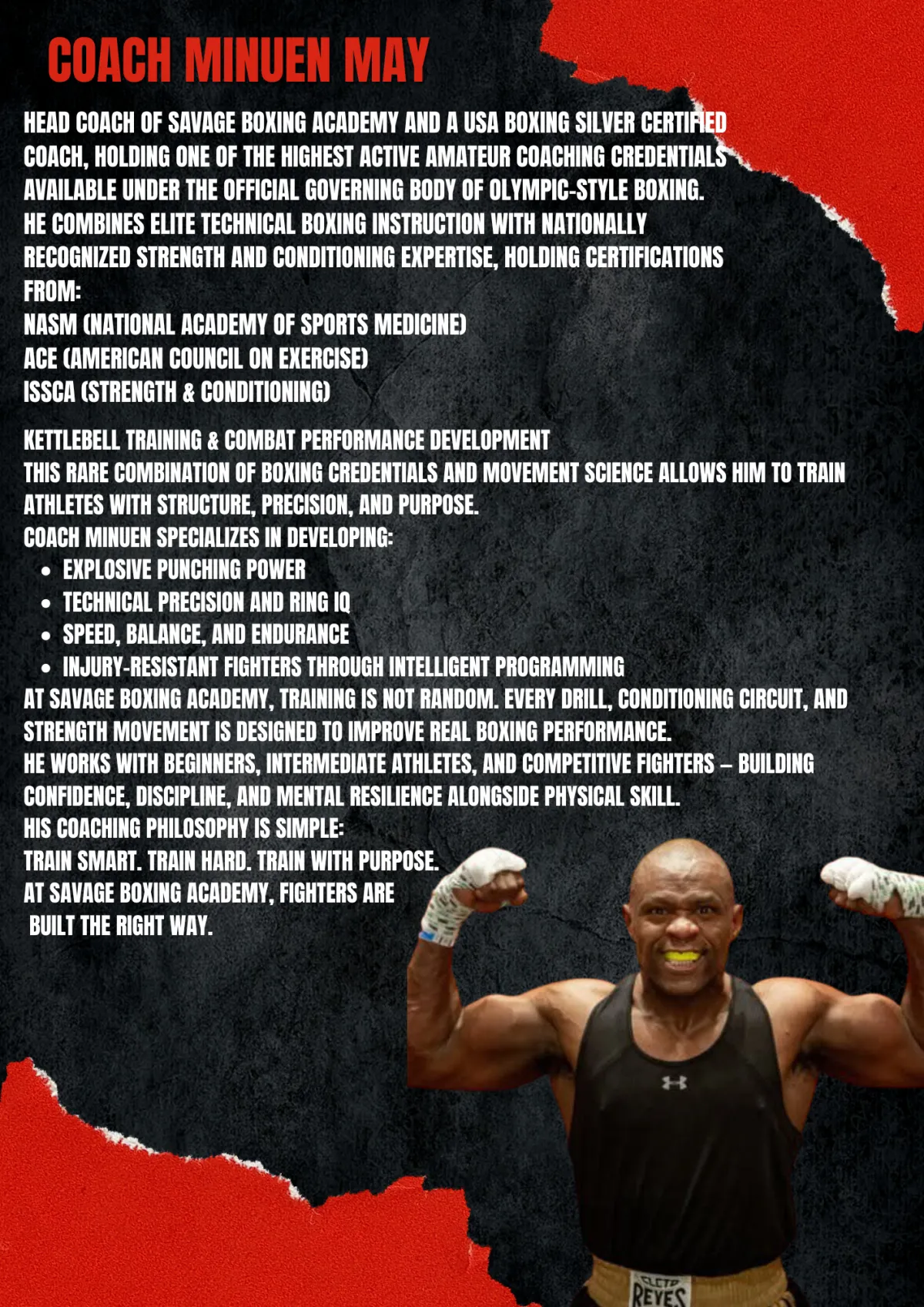 A: Our head coach and owner is Coach Minuen May. Our coaching team also includes Coach Dennis McKinney, Coach Kevin Timmons, Coach Nicole Moore and Coach Erin Johnston. All coaches bring years of boxing experience and a passion for teaching.
